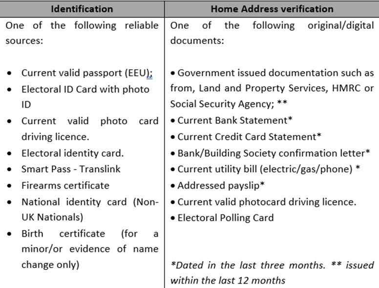 A valid photographic ID (e.g., Driving Licence, Passport, Senior Smart Pass) in addition to a separate Proof of Address dated within the last 3 months (e.g., bank statement, utility bill or government agency letter).